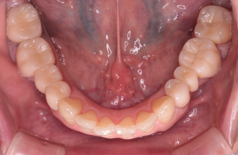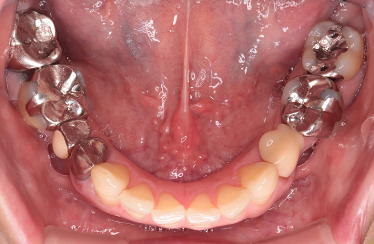 | ②治療説明 | 銀歯が気になり、歯を白くしたいと来院されました。 形の悪かったブリッジも全てセラミックに置き換え、大変喜んで頂けました。 |